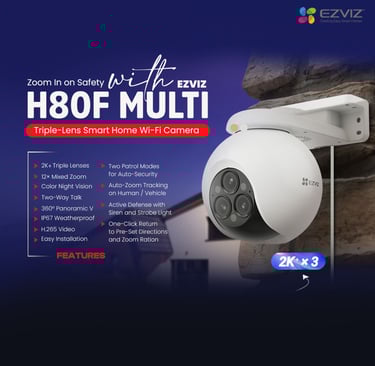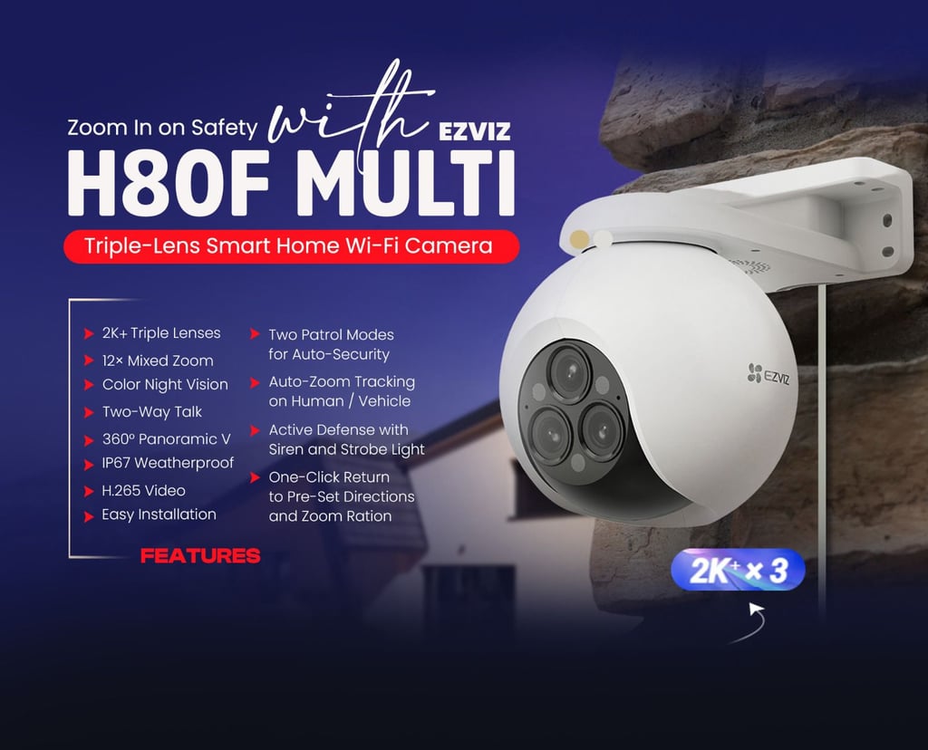 H80f Multi 2K+ x 3 ✨ Triple-Lens Smart Home Wi-Fi Camera The H80f Multi, EZVIZ‘s first triple-lens outdoor camera, is designed to provide exceptional outdoor security with unseen professionalism. The integrated capability of three powerful 2K+ lenses allows the camera to capture a wide view and close-up details simultaneously, supported by an incredible, non-blurry 12-times zoom. Its embedded AI can effectively detect and lock on both people and vehicles to record an ongoing activity from left to right, while you receive more informative mobile alerts accompanied by double snapshots of both the visitor and the car.